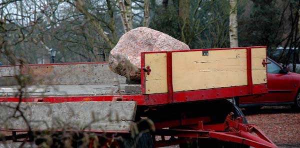 In de Drentse bodem bevinden zich vele zwerfkeien die in de IJstijd vanuit Scandinavië hier naar toe gevoerd werden. Bijna in elke tuin ligt wel zo'n knaap. Wij vonden dat wij niet konden achterblijven en kochten zo'n indrukwekkende kei. Het was een hele operatie om hem op zijn bestemming te krijgen. Hieronder een fotoverslag van deze 'eerste steenlegging'.