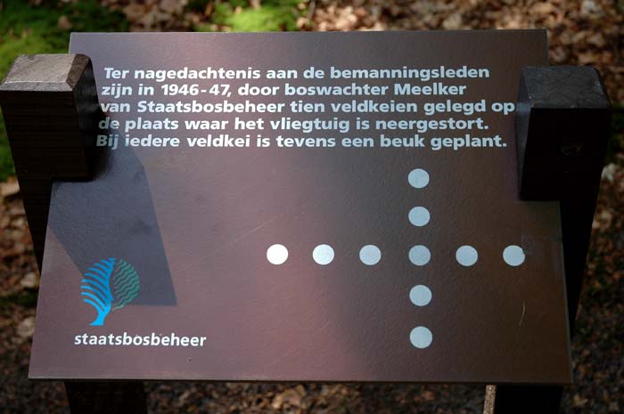 In 1946-47, in memory of the crew, forester Meelker of 'Staatsbosbeheer' placed 10 erratic boulders on the spot where the plane crashed. Beside every boulder a beech was planted.