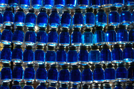 Opgebouwd uit duizenden kleine flesjes, gevuld met een blauwe vloeistof /
