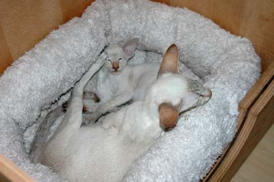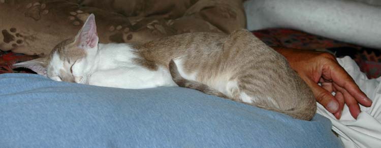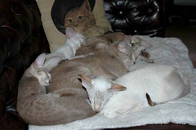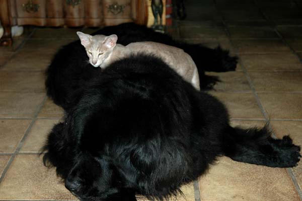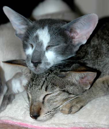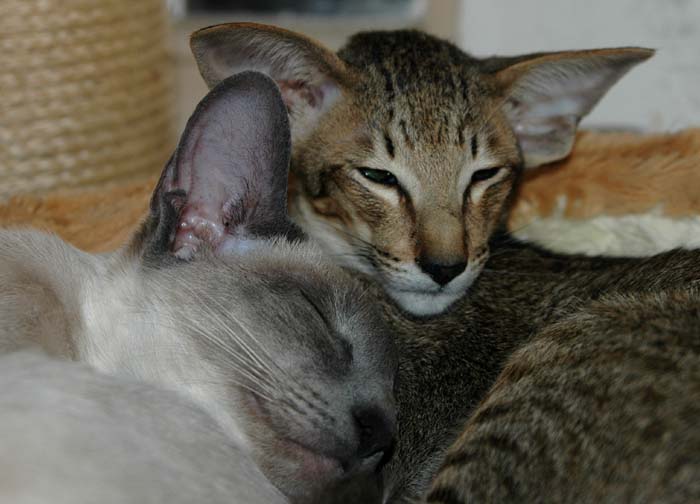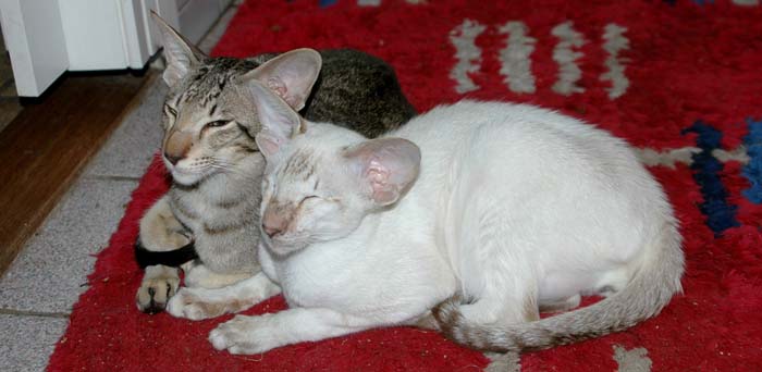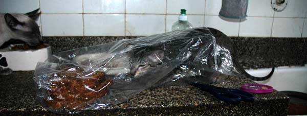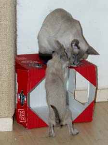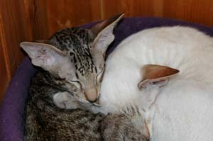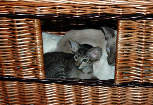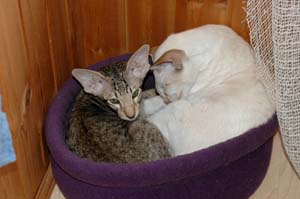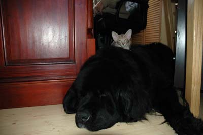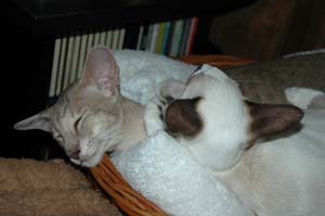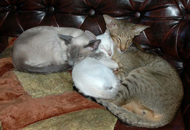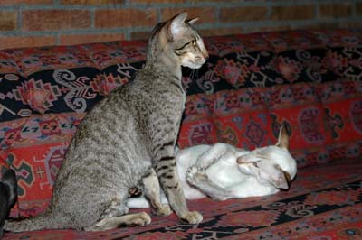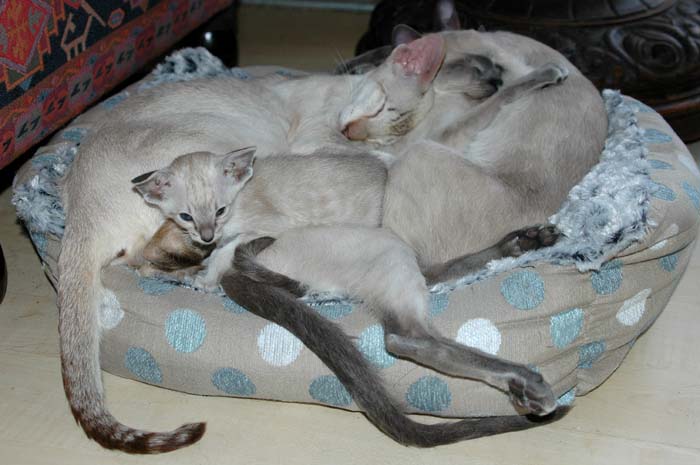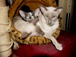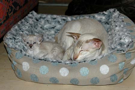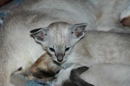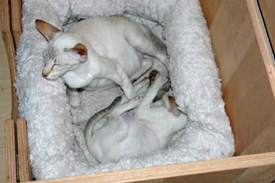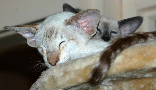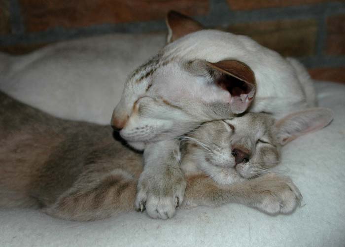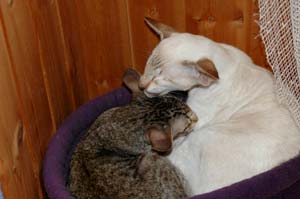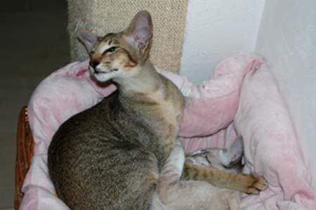 Lily, expecting her litter any minute, makes sure that she at least has one kitten. Sweety found himself a new mommy :-)