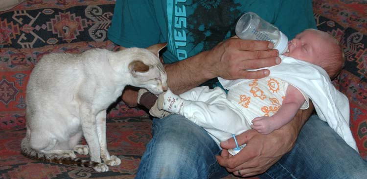 Sweety was zeer geïnteresseerd in dit kleine mensje - - Sweety was very much interested in this small human being