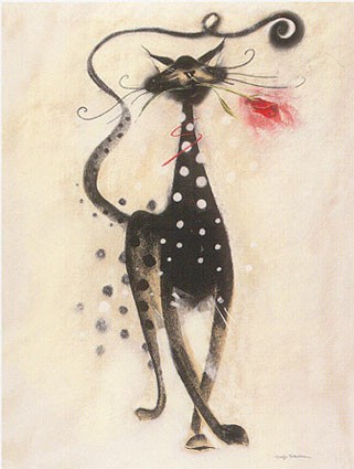 While she, with purr and velvet paw
