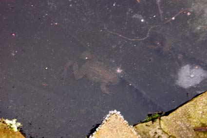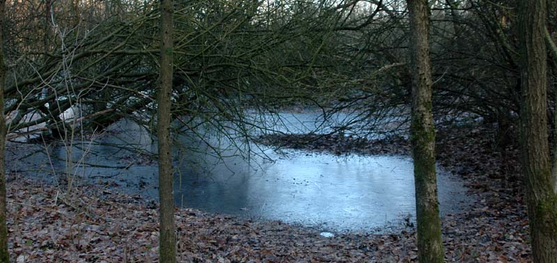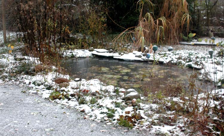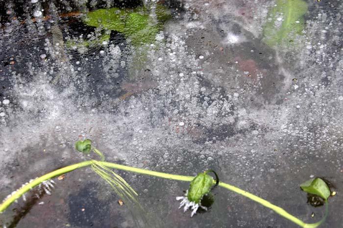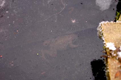 Ice on our pond and the frogs are hiding under it .... having their winter-sleep